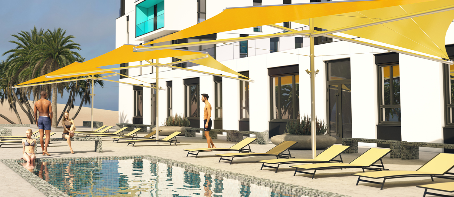 Individuelle Planung und Formenvielfalt gehören bei den festverspannten SunFurl Sonnensegeln zum Standard und ermöglichen eine spannende 3D-Architektur.